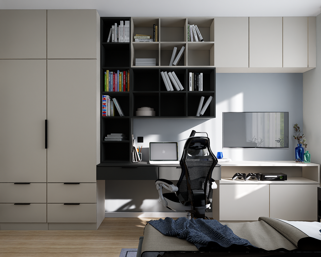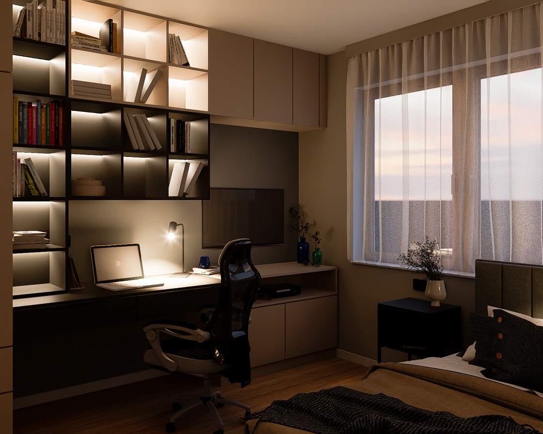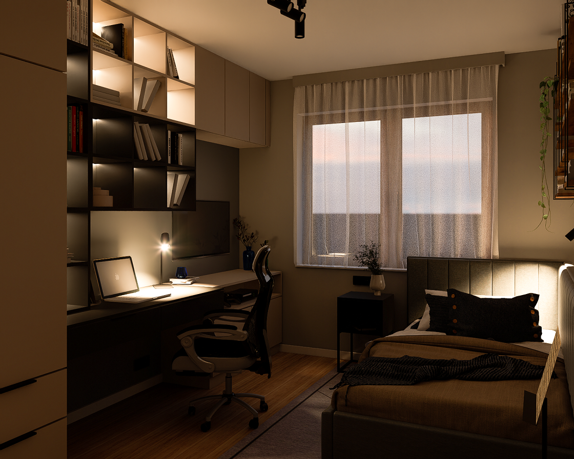 Przeprojektowaliśmy układ: powstał długi blat roboczy z biblioteczką i miejscem na sprzęt, pojemna szafa oraz strefa relaksu z tapicerowanym łóżkiem w narożniku. Zaplanowaliśmy oświetlenie – szynoprzewód, lampkę zadaniową i nastrojowe LED-y podświetlające półki.
