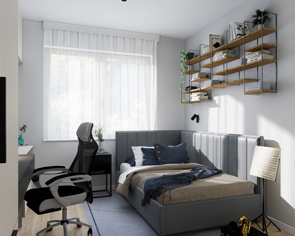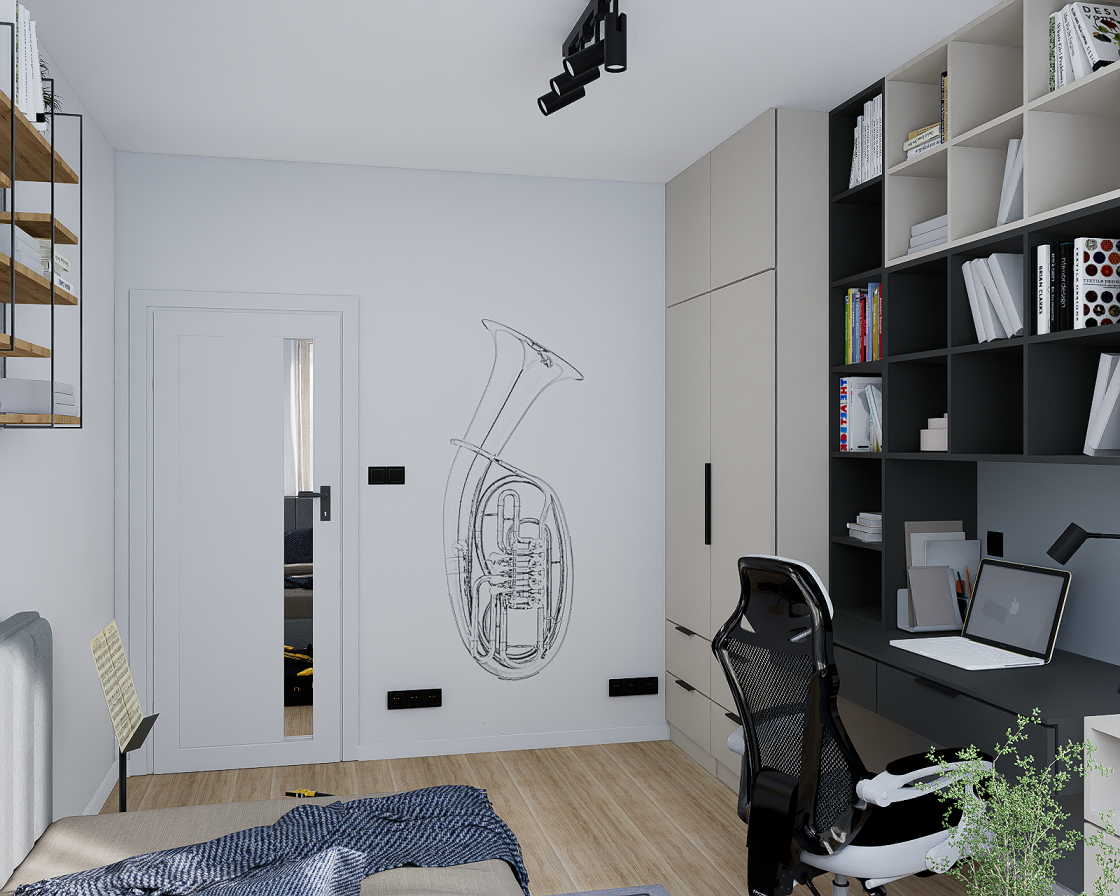 Całość łączy stonowana kolorystyka, ciepłe drewno i lekka zabudowa z czarnymi detalami. Otwarta i zamknięta przestrzeń do przechowywania, metalowe półki i personalizacja motywem muzycznym tworzą pokój, który rośnie z właścicielem: przytulny, funkcjonalny i gotowy na codzienne życie.